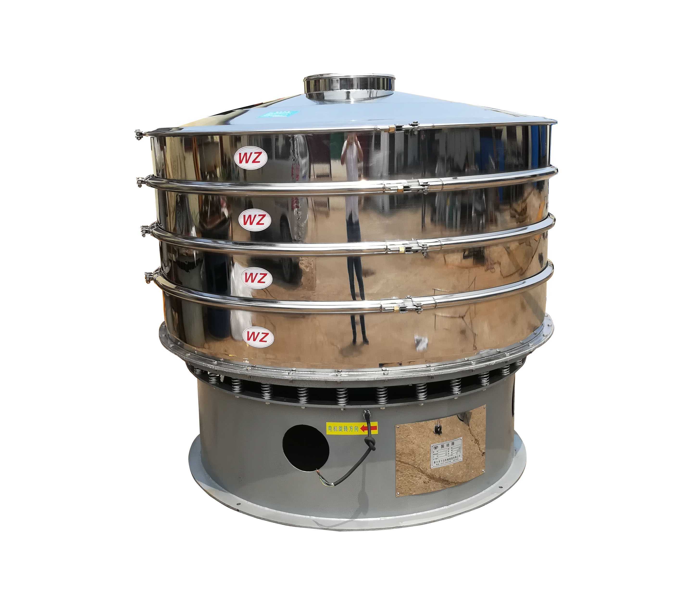 2.旋振篩的篩面是圓形篩網(wǎng),物料入口位于圓形篩網(wǎng)的中心位置,物料從篩面中心加入,由于篩面的旋擺振動(dòng),使得物料呈螺旋線方向圓周運(yùn)動(dòng),出料口可以沿著圓周方向任意布置,這使得旋振篩制造簡(jiǎn)單方便。